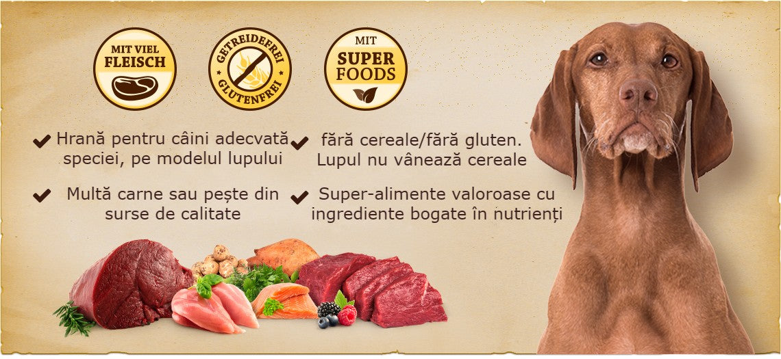 De la Munții Stâncoși din America de Nord, tundra arctică, munții și pădurile Europei până la deșerturile și stepele din Asia Centrală, lupii își vânează prada. Le aprovizionează cu carne și organe și, prin conținutul stomacului, și cu legume, fructe, rădăcini și ierburi. Cerealele se găsesc rar aici. Mâncarea de la WOLFSBLUT se bazează pe aceste habitate și pe diversitatea lor alimentară colorată. De la selecția de cărnuri extraordinare până la superalimentele bogate în nutrienți: WOLFSBLUT oferă fiecărui câine o dietă adecvată speciei și originală.